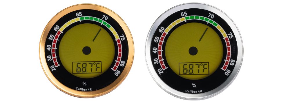 The latest version of our acclaimed Caliber series digital hygrometer. The Caliber V features the same slim profile design, with large 'E-Ink Display for humidity & temperature readings. Can be set to Fahrenheit/Celsius. It arrives pre-calibrated out of the box. Gauges between 20-90% Relative humidity (RH)